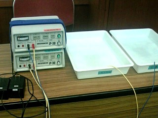 これは、多汗症の治療の装置。最前列の特権。何でも見学して、何でも質問です。炎症性角化症(掌蹠膿庖症)についての理解も随分深まりました。